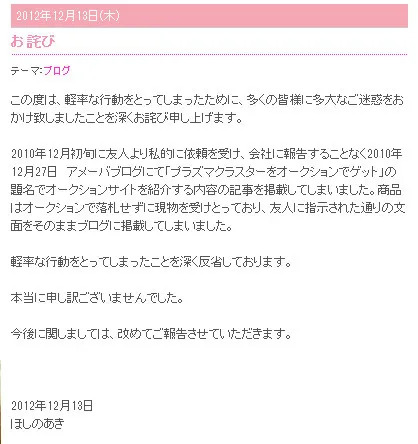 虚偽の紹介記事をブログで公開していました。